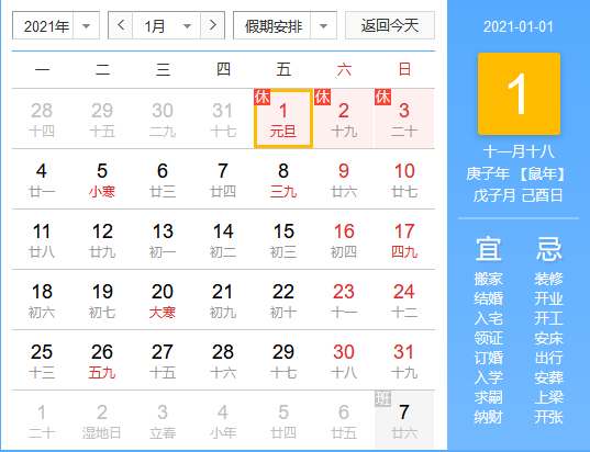2021年1月1日(星期五)至1月3日(星期日)放假,共3天。